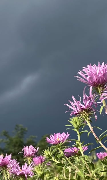 While exploring the area, I was drawn to the vivid contrast of the pink Bee Balm flowers against the stormy sky.