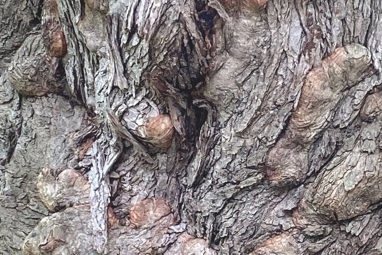 The bark carries its history openly, knots and scars pressed into the surface like a record of everything it has endured.