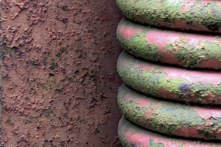 I was drawn to the contrast — the coiled spring with moss filling its chipped paint, set against the flat, rusted surface beside it. Opposites, but balanced in the frame.