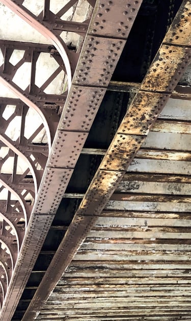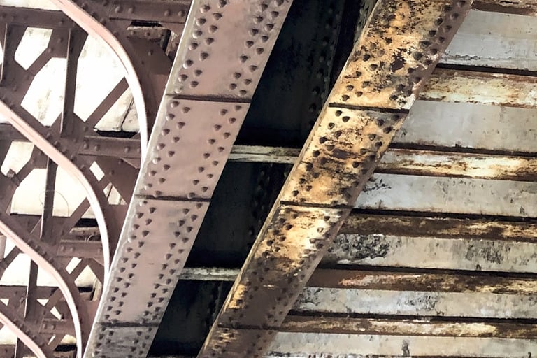 Steel and wood meet under tension, each carrying its own wear. The rivets bind it all together, holding the span steady.
