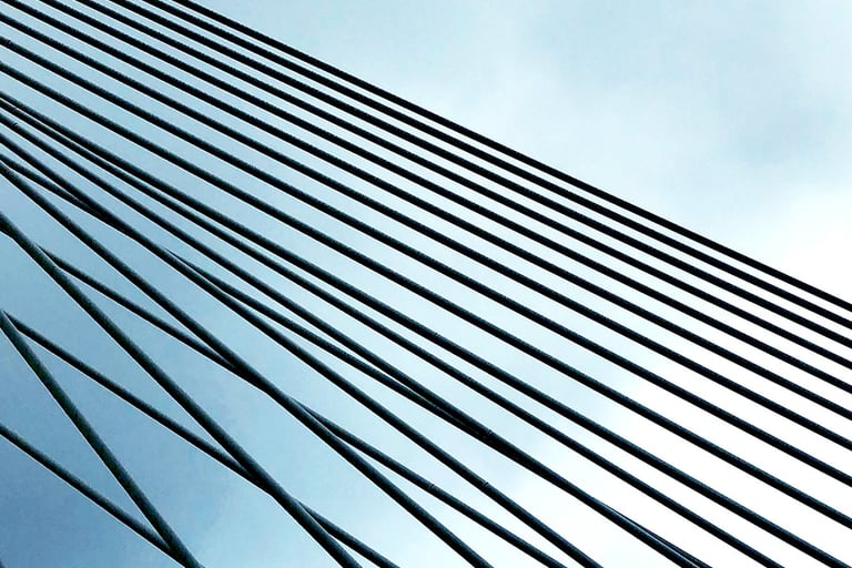 I was struck by the sharp angles of these steel bridge cables and their contrast against the open sky.